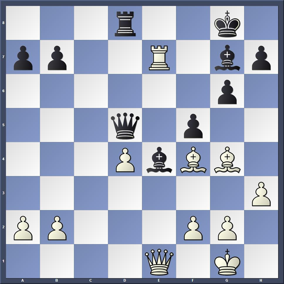 Die ersten beiden Züge sind ziemlich naheliegend, aber der 3. Zug bedarf ziemlich viel Vorstellungskraft 1.Ld1! Die Dame droht aufgespießt zu werden durch 2.Lb3 1…Dxd4 2.Lb3+ Kh8 3.Da5!! (3 Punkte) Die Dame ist ideal platziert und Weiß droht 4.Txg7 welches Schwarz vor unlösbare Probleme stellt. 3…b6 [3…Lf6 4.Dc7! Lxe7 5.Le5+ Lf6 6.Lxd4 Txd4 7.Df7 Nebst Matt.] 4.Dxa7 Mit der Drohung 5.Lh6! 4…Ld5 5.Lxd5+–