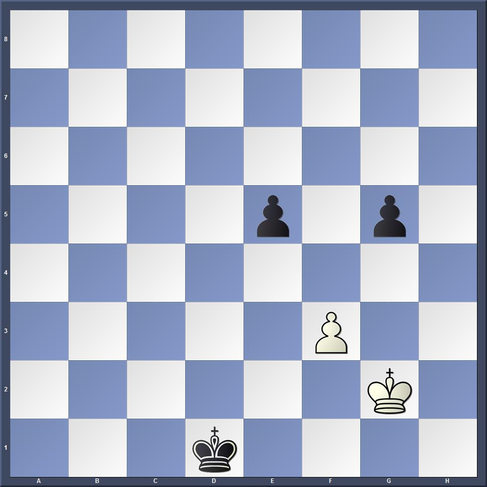 Nur die Fernopposition (bei drei oder fünf Feldern spricht man von der Fernopposition; Eine Opposition kann auf einer Diagonalen, Horizontalen oder Vertikalen vorkommen) rettet Weiß. 1.Kh1!! [1.Kg3? Ke1! 2.Kg2 Ke2 3.Kg3 Kf1! –+ Das einnehmen der Nahopposition verliert die Partie für Weiß. 1.Kf1Kd2 2.Kf2 weil nach 2…Kd3 der Bauer auf f3 dem König den Zugang versperrt.3.Kf1 (3.Kg3 Ke3 4.Kg2 Ke2!–+) 3…Ke3! 4.Kg2 Ke2–+] 1…Kd2 [1…g4 2.Kg2! Kd2 3.fxg4=] 2.Kh2 Kd3 3.Kh3=