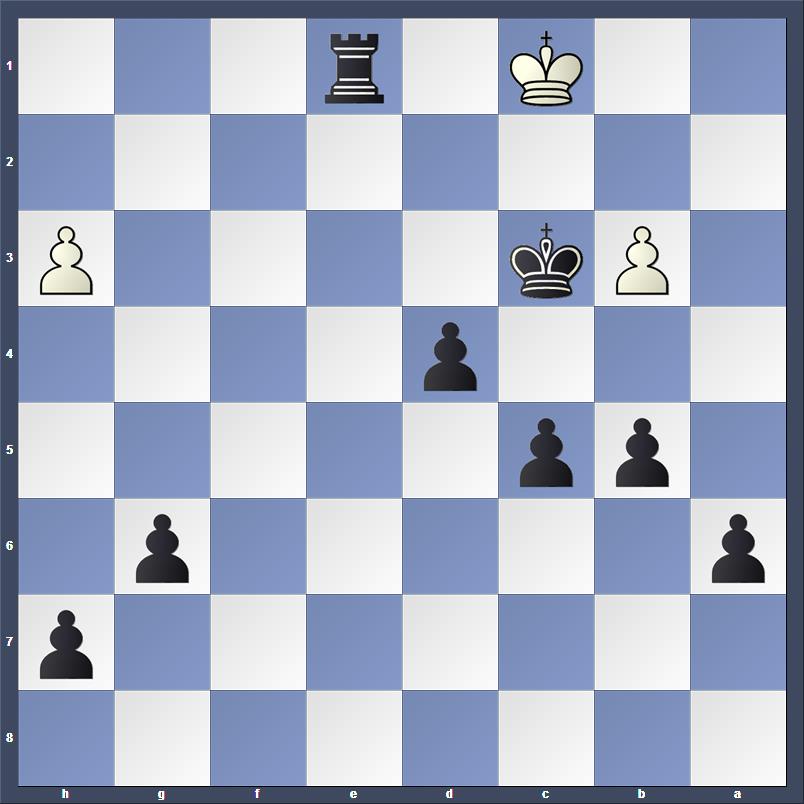 30. Tc7-c6 (sperrt den weißen Turm auf nur noch c6 selbst ein, nur durch Opfer von b3 zu befreien.) Kf7-e6 (schwarzer König auf f7 beginnt Jagd auf eingesperrten weißen Turm auf c6.)