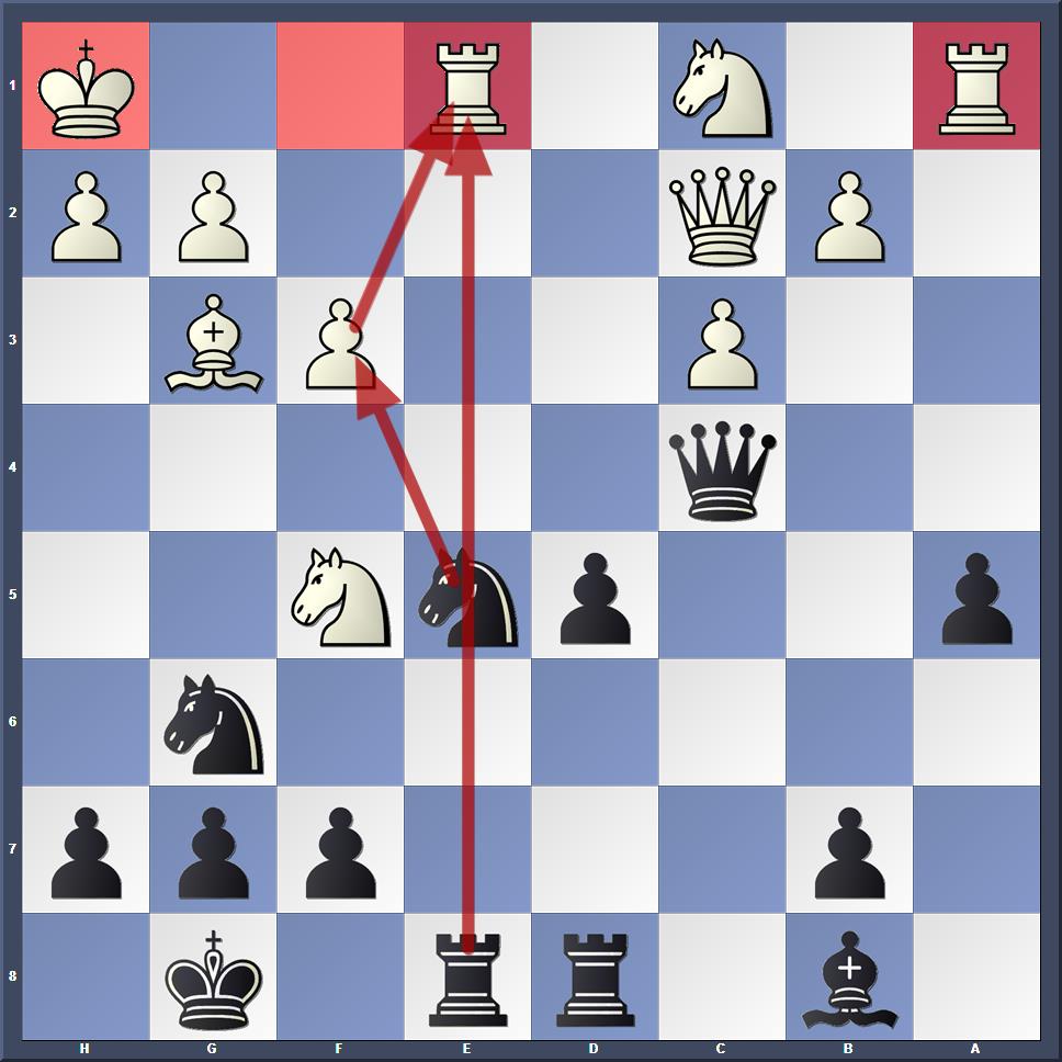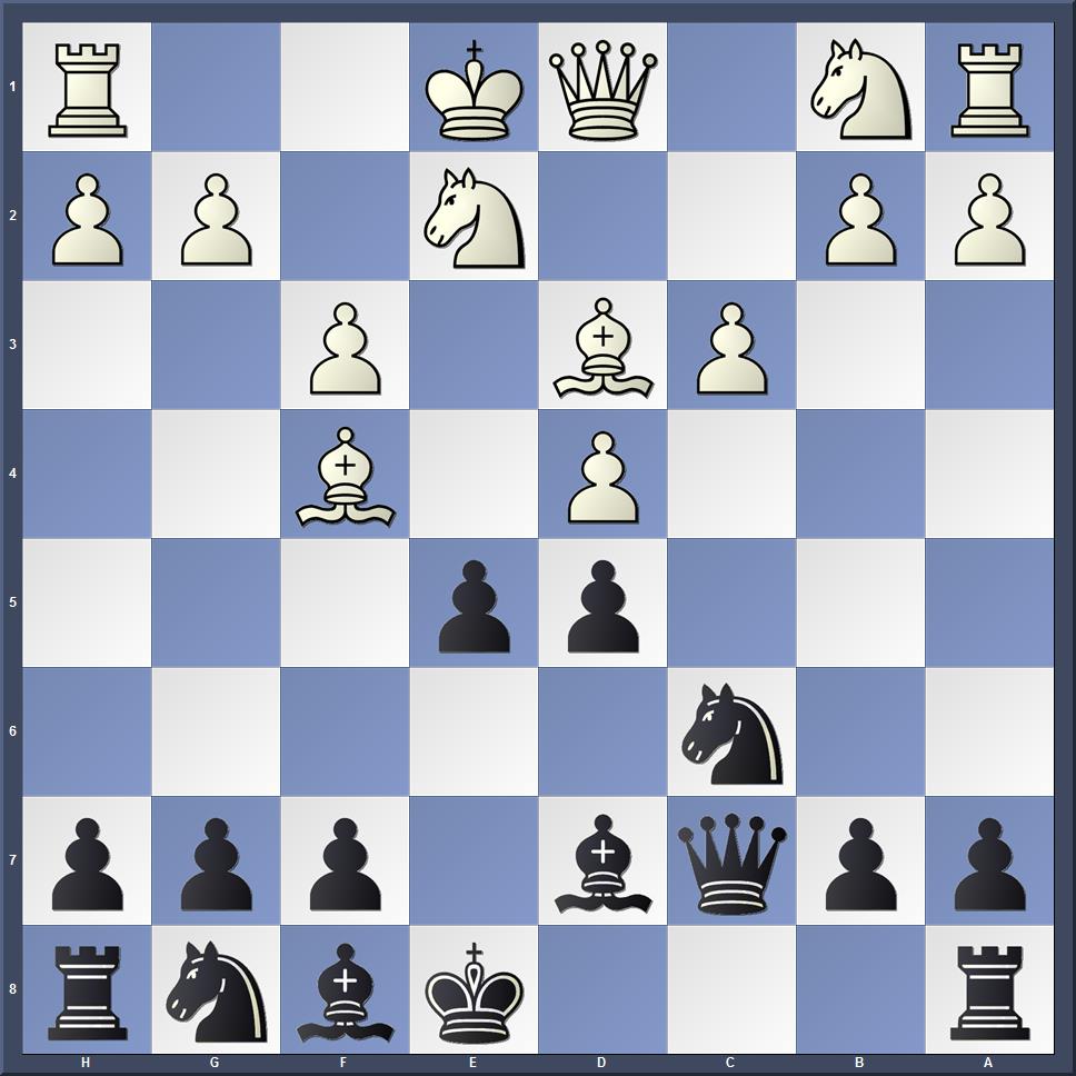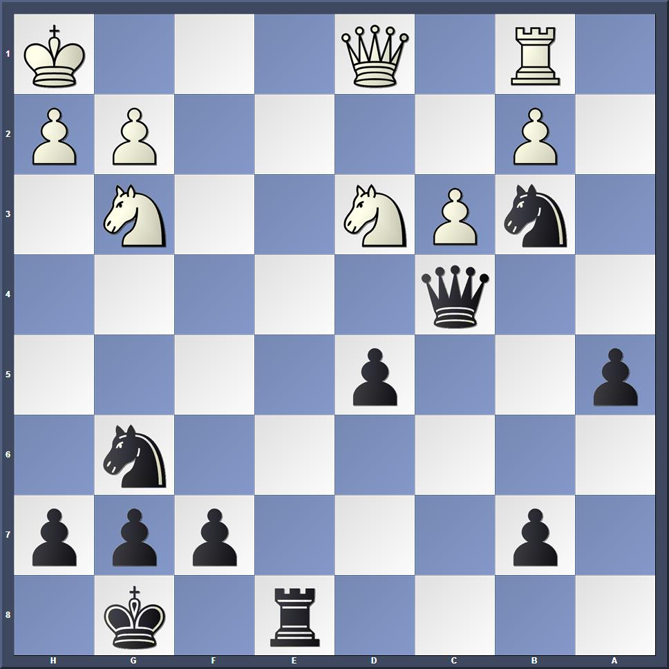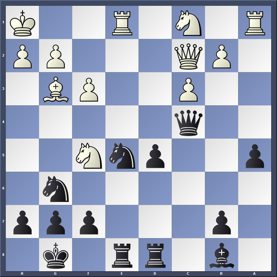 12…Tad8 Beide Seiten haben ihre Entwicklung abgeschlossen und der Übergang ins Mittelspiel steht an. Schwarz hat vielleicht eine leichte Initiative, aber wie fortsetzen? Nach meinen Notizen habe ich ca. 2o Minuten für den Zug 12…Tad8 aufgewendet. Abschließend lässt sich wohl nicht sagen welcher der Beste Zug ist. Als Kandidatenzüge kommen einige in Frage z.B. 12…Tfe8, 12…a6 welches eine Prophylaxe gegen einen möglichen Springerausfall nach b5 wäre, falls Weiß mit 13.dex5 Sxe5 14.Sed4 fortsetzt, aber wahrscheinlich etwas zu passiv ist oder 12…f6 welches das Zentrum stützt aber die Diagonal a2–g8 schwächt. 13.Kh1 Zu verhalten für mein Geschmack. 13…Lf5 Mit der Idee den aktiven Läufer abzutauschen. 14.Dc2?! Lg6 Diese Motive hatte ich schon vor Augen 14…Sb4 15.cxb4 Dxc2 16.Lxc2 Lxc2= welches aber nicht mehr als zum Ausgleich reicht. 15.Tae1 a5?! Mit der Absicht 16…a4 zu spielen und mit der Hoffnung verbunden das Weiß zu 16.a4 greift und 16.Sb4 mehr Durchschlagskraft bekommt. Aber das Prinzip Hoffnung ist kein guter Ratgeber im Schach und 15…a5 schwächt das Feld b5 wie anfänglich schon erwähnt. 16.dxe5! [16.a4 Sb4 17.cxb4 Dxc2 18.Lxc2 Lxc2 19.Sc5 Lxc5 20.bxc5 Sc6 21.dxe5 d4!] 16…Sxe5 17.Lxg6 S7xg6 18.Sbd4 Dc4 Aktive Verteidigung; Möglich ist auch 18…Dd7. 19.Sf5 Lb8 Zu diesem Zeitpunkt hatte ich noch 49 Minuten auf der Uhr. 20.Td1?! Tfe8 Mit der Drohung 21…Sxf3. [20…Dxa2 Habe ich verworfen, weil ich den sofortigen Rückgewinn des Bauern a5 antizipierte. 21.Ta1 Dc4 22.Sed4 (aber nach 22.Txa5? ist 22…d4 sehr stark.) 22…Sc6 23.Lxb8 Txb8 24.Tfd1=] 21.Tfe1? Vergibt den leichten Vorteil von Weiß. 21…Dxa2 22.Ta1?! Dc4 Es droht 23…Sd3. 23.Sc1?? Weiß zeigt Nerven und hat in den letzten Zügen seine Stellung ruiniert. Welches wahrscheinlich auch der Komplexität der Stellung und dem Zeitmangel, der sich langsam einstellte, geschuldet war.
