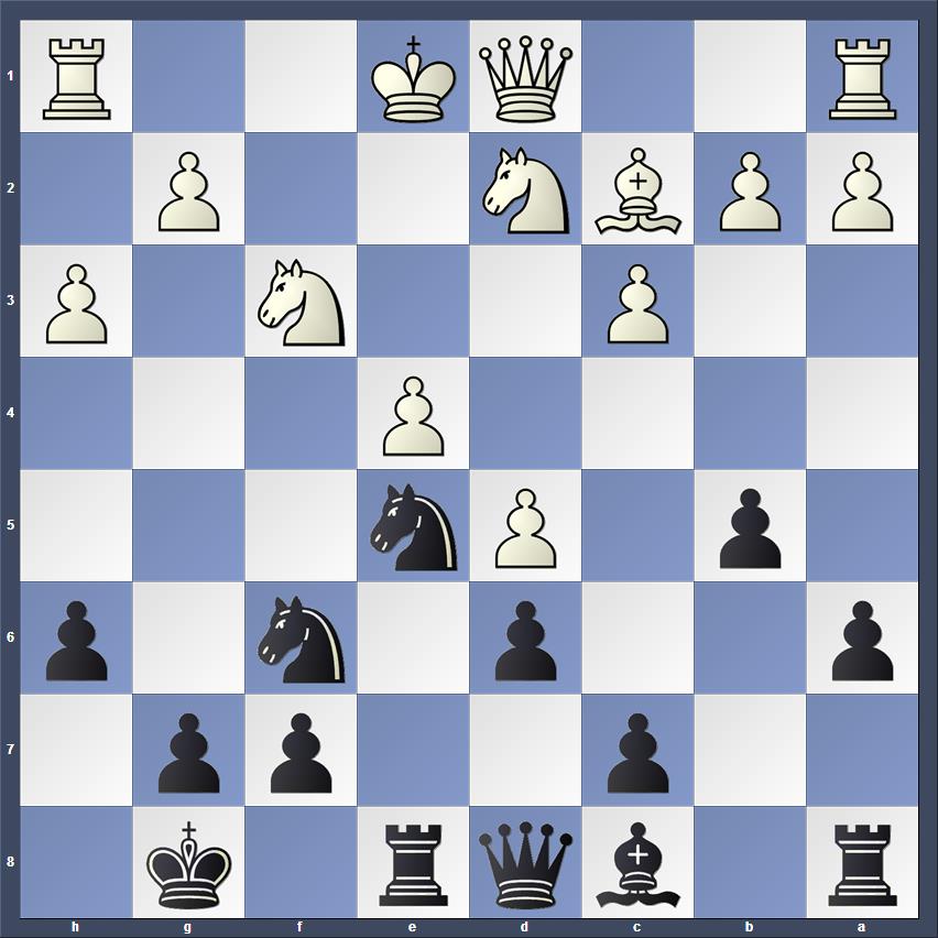Statt Lc8-b7 (zur Vorbereitung von c7-c6 und Druck auf d5 bzw. e4) hätte ich besser Sf6xd5 spielen sollen, denn nach e4xd5 folgt Se5xf3++, womit Schwarz einen Mehrbauern erhält und Weiß durch Doppelschach (Sf3+Te8) zusätzlich das Rochaderecht verliert. Dies habe ich jedoch erst nach Ausführung meines Zuges und Betätigung der Uhr bemerkt, somit war es dafür zu spät. Mein Gegner hat mir danach auch keine Gelegenheit mehr gegeben, diese Kombination doch noch spielen zu können.