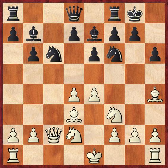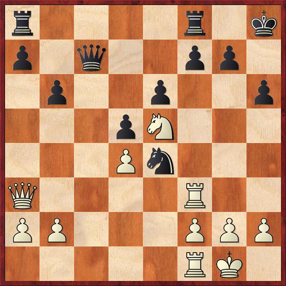 Schwarz hätte g5 g4 versuchen können 11.Sb3? Verrliert nicht nur einen Bauern, stellt den Springer auch auf ein schlechteres Feld, nach c5 kann er ja nicht. Außerdem tauscht Weiß nach S b4 seinen schönen Läufer auf d3. a3 war geboten. 11…Sb4 12.De2 Sxd3+ 13.Dxd3 Sxe4 14.Lxe7 Dxe7 15.0-0 Tfc8 16.Tac1 Sg5 17.Sbd2 Df6 18.Se5 d6 19.Sec4 La6 20.Da3 Lxc4 21.Sxc4 d5 22.Se5 Df4 23.Sc6 Kh8 Weiß hat sich gefangen, die weißen Figuren stehen etwas aktiver. 24.Tc3 Se4 25.Tf3 Dc7 26.Se5 Tf8