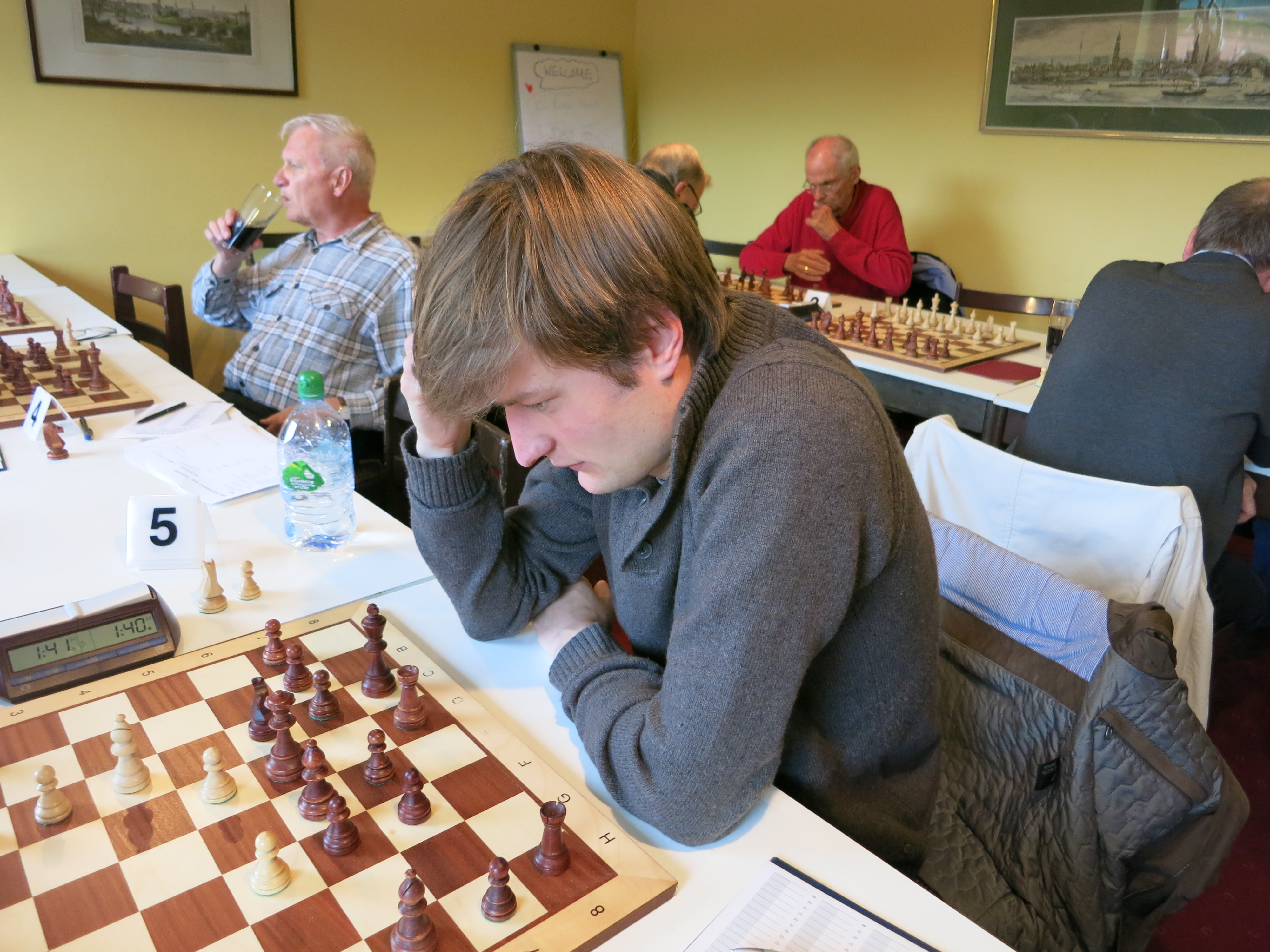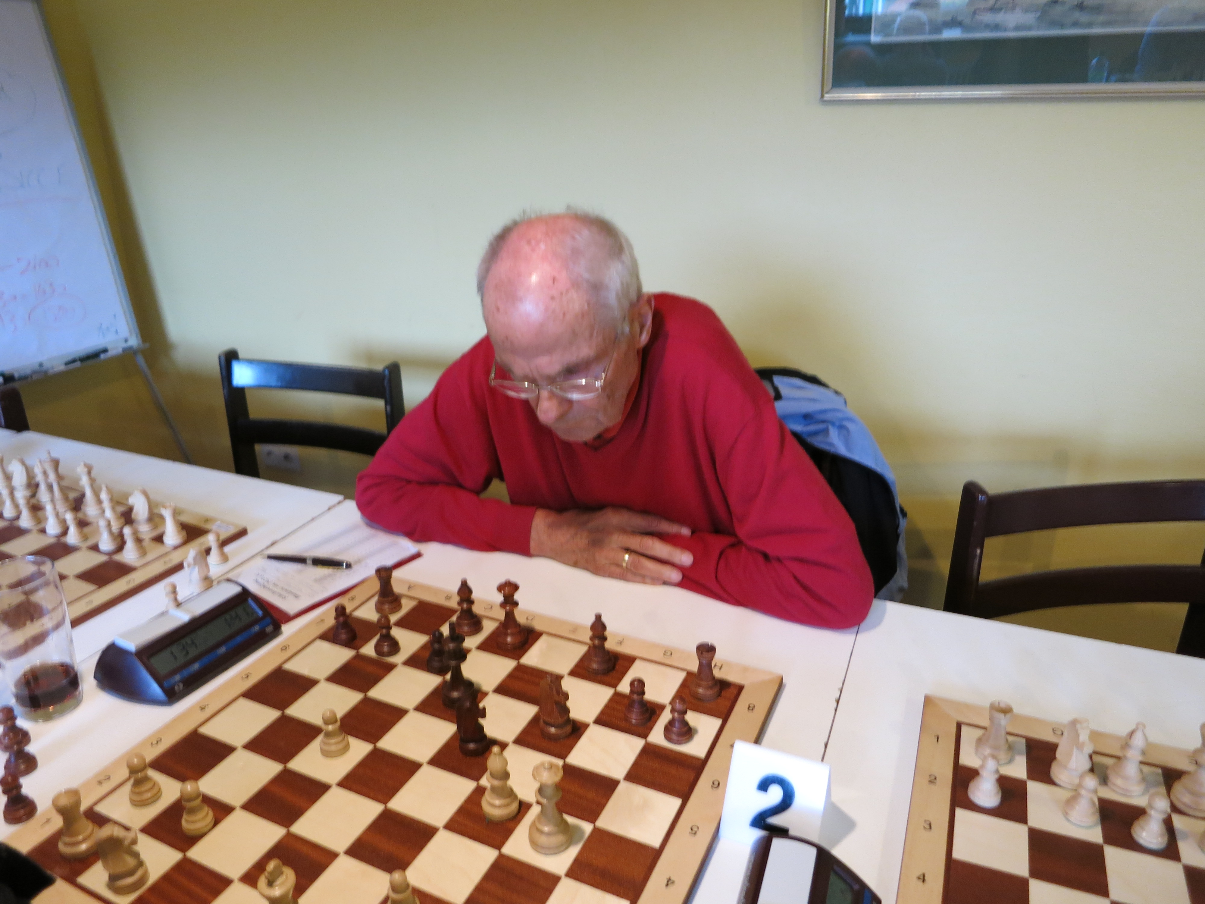 Die 1. Blitzpartie gewann Alfred, die 2. Michael. Es kam also zum sudden death ,zur 3. Partie. Diese gewann erwartungsgemäß Alfred, der als sehr guter Blitzspieler bekannt ist.