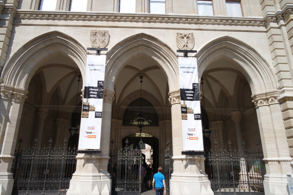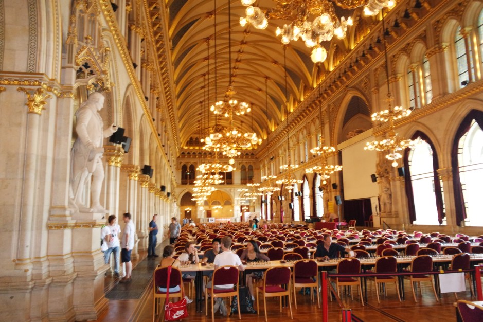 Diese Woche findet das Wiener Schach open statt. Es gibt 860 Teilnehmer aus 56 Nationen. Ein Grund für diesen Zuspruch dürfte das herrschaftliche Ambiente des Turniersaals im Wiener Rathaus sein. Ein Saal für 600 Spieler mit Stuck, Kronleuchtern und anderen Verzierungen, Aufgrund des Teppichbodens ist es während der Partien ganz besonders ruhig.