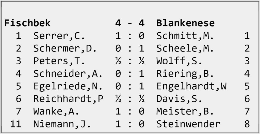 Wir haben damit 4 zu 4 gespielt. Wir haben eine Runde vor Schluss 9 Mannschafts- und 33,5 Brettpunkte. Bislang hatte eine Blankenese Mannschaft in 2012 9 Mannschafts- und 31 Brettpunkte erreicht. Wir haben also die beste Leistung aller Blankenese Zeiten erzielt. Das 2. Saison Ziel ist erreicht.