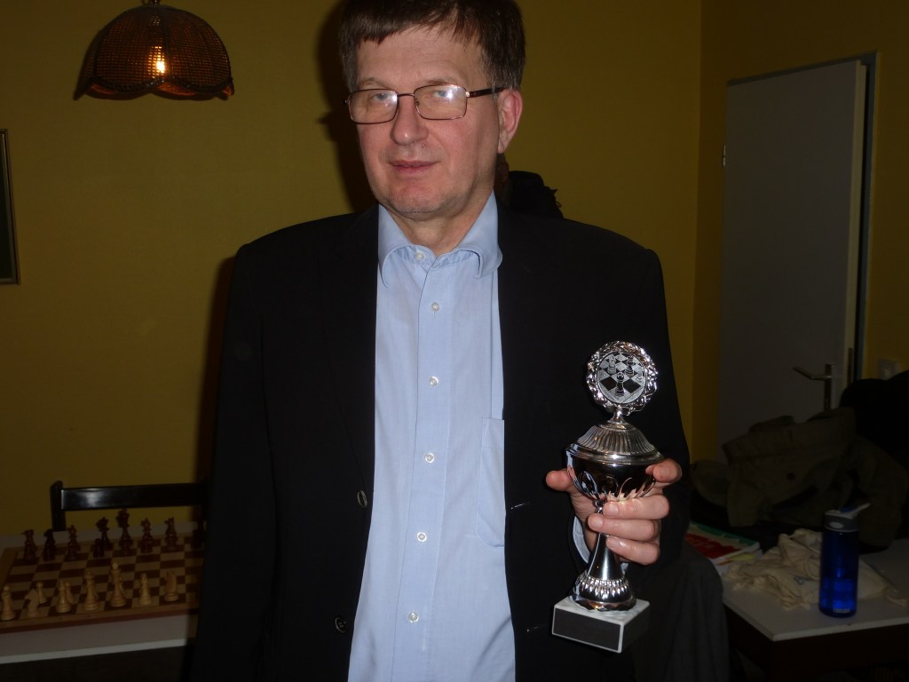 Außer Konkurrenz startete, wie schon bei der Blitzmeisterschaft kurz vor Weihnachten, unser ehemaliges Mitglied, Michael Kotyk. Er war der Favorit und wurde dieser Rolle mit 4,5 Punkten aus 5 Partien gerecht. Nur Eurem Berichterstatter gelang es ein Remis zu erzielen.