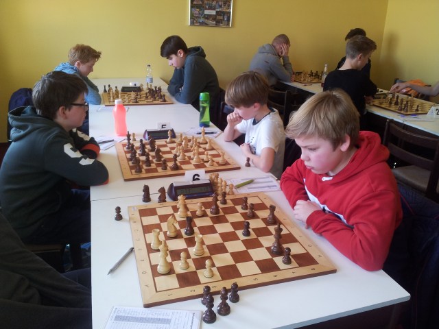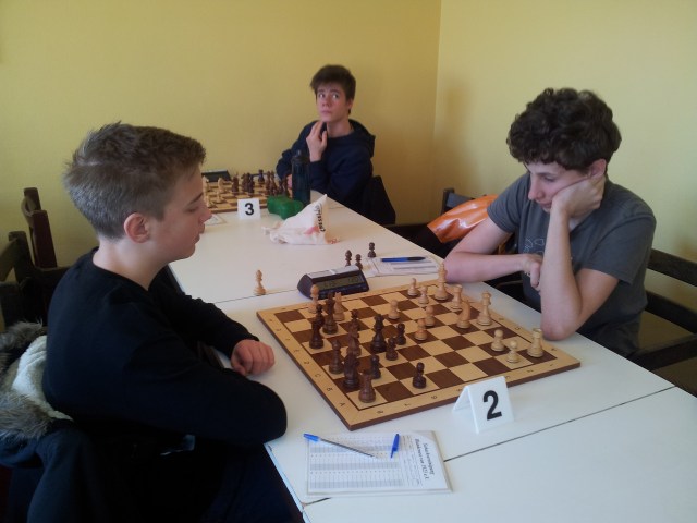 Nun kam es auf Niklas Dominico an, der an Brett 4 am längsten zu kämpfen hatte. Nach einer von beiden Seiten recht ordentlich gespielten Eröffnung, entschied sich sein Gegner zu einem waghalsigen Bauernsturm am Königsflügel, noch bevor die Entwicklung abgeschlossen war. Das war nicht ungefährlich, bot aber auch Konterchancen. In der wechselvollen und durch Taktik geprägten Partie fanden beide Seiten nicht immer die geeigneten Mittel. In der Zeitnotphase hätte Niklas die Partie durchaus noch für sich entscheiden können. Doch leider beging er den letzten Fehler und stellte eine Figur ein.