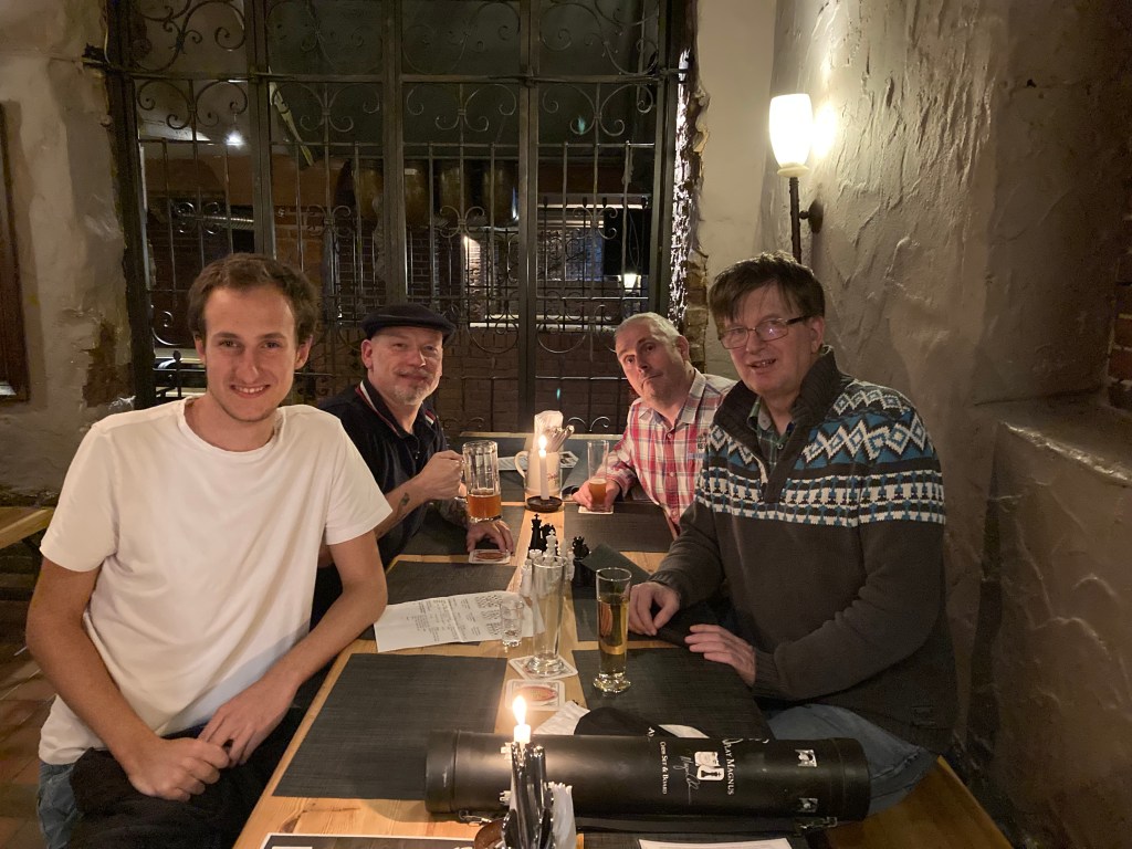 Leider fanden nur 4 (!) aller in dieser Saison eingesetzten Spieler den Weg ins Groeninger (die gleichen, die auch an der HPMM 2023 teilnahmen). Der ausgewählte Termin schien etwas verflucht gewesen zu sein … Immerhin hatten wir auf dem Tisch im Groeninger soviel Platz für uns, dass wir ein Schachspiel aufbauen und einige Partien analysieren konnten. Mein Bier und die Haxe passten auch noch drauf. Eine gewisse Vorstellung wie die Mannschaft 2024 aufgestellt werden könnte, haben wir ebenfalls entwickeln können.