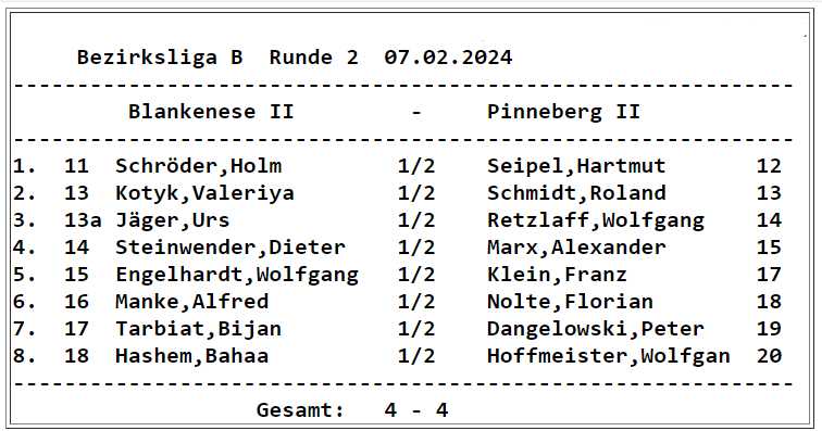 In der Bezirksliga B hatten wir am 7. Februar die Mannschaft von Pinneberg 2 zu Gast. Es kam zu einem ungewöhnlichen Ergebnis: Alle acht Partien gingen unentschieden aus. Ungewöhnlich war aber auch, dass dieses Ergebnis so nicht zu erwarten war. Es gab nämlich beträchtliche Unterschiede in den Wertungszahlen der Spieler. Jeder Blankeneser war seinem Gegner nominell überlegen. Im Schnitt hatten die Blankeneser Spieler einen DWZ-Vorsprung von 186 Punkten gegenüber den Pinnebergern. Die statistische Gewinnerwartung lag damit bei 6:2 für Blankenese.