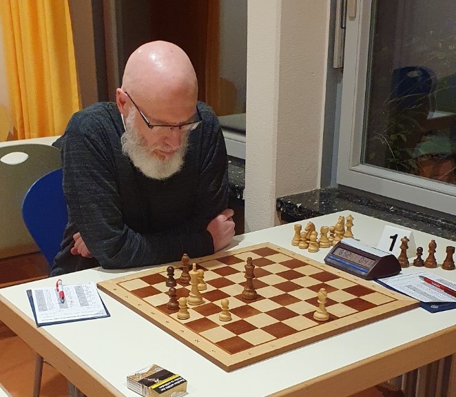 Trotz der kurzfristigen Verlegung des Spielorts erschien St. Pauli 6 in unerwartet starker Besetzung. Ein ausgewogener Kampf war zu erwarten und so kam es auch. Nach vier Stunden Spielzeit stand es 3,5:3,5 und die Partie am Spitzenbrett musste die Entscheidung bringen. Der Blankeneser Spieler Holm Schröder hatte im Mittelspiel einen Bauern gewonnen und trachtete nun danach, seinen Vorteil im Endspiel zu verwerten. Sein Gegenspieler, Ingo Krüger vom FC St. Pauli, kämpfte um das Remis. Nach 59 Zügen kam es zu dieser Stellung: