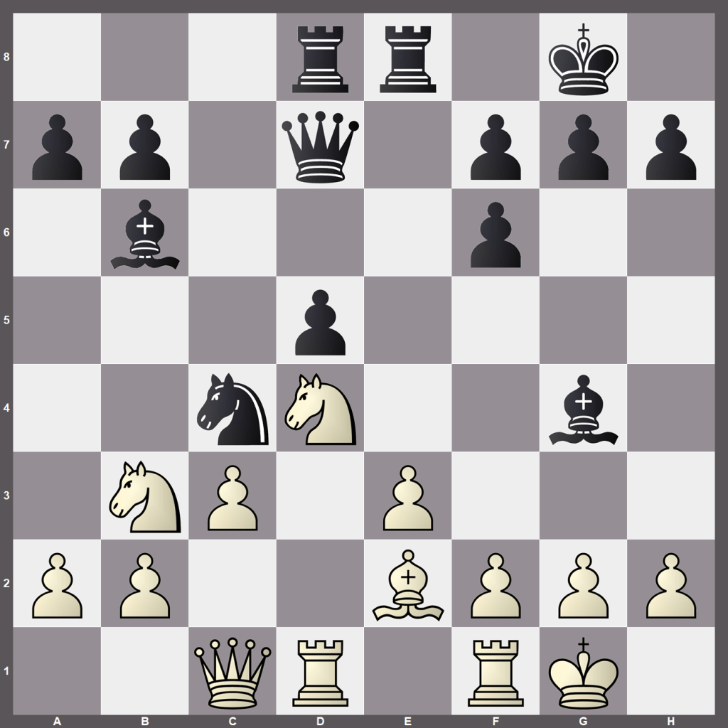 In dieser Stellung war Hauke gerade mit 15.Dd2-c1 dem Angriff des schwarzen Springers ausgewichen. Oscar erkannte sofort, dass dies ein schwerer Fehler war und zwang seinen Gegner nun in zwei Zügen zur Aufgabe.