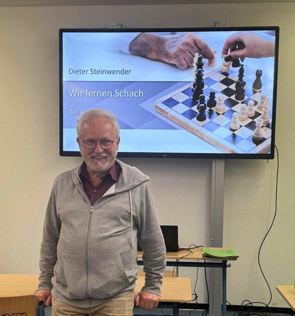 Unser Dieter Steinwender hat wieder „eingeschlagen“! Mit seinem dritten Schachkurs für Erwachsene hat unser Clubmitglied Dieter wieder einmal erfolgreich einen Schachkurs als Trainer abgeschlossen und erwachsenen Schachinteressierten das „königliche Spiel“ auf 64 Feldern beigebracht.