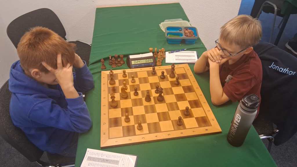 Der abschließende Wettkampf gegen SKJE gestaltete sich dann leider viel spannender und zäher als es den Mannschaftsführern lieb war. Thore und Arjun spielten flott, hatten schon bald Endspiele erreicht, aber das von Thore war verloren und das von Arjun bot auch nur Aussicht auf Remis… Dafür spielte Xaver routiniert in der Eröffnung und eroberte einen ganzen Turm. Nach zähem Ringen setzte sich dann auch Kaichen durch! Puh, noch mal gut gegangen… wieder mit 2,5 Punkten gewonnen.