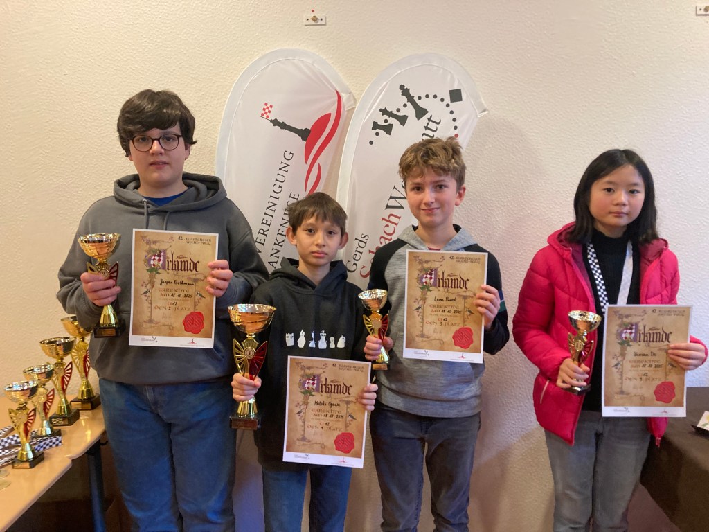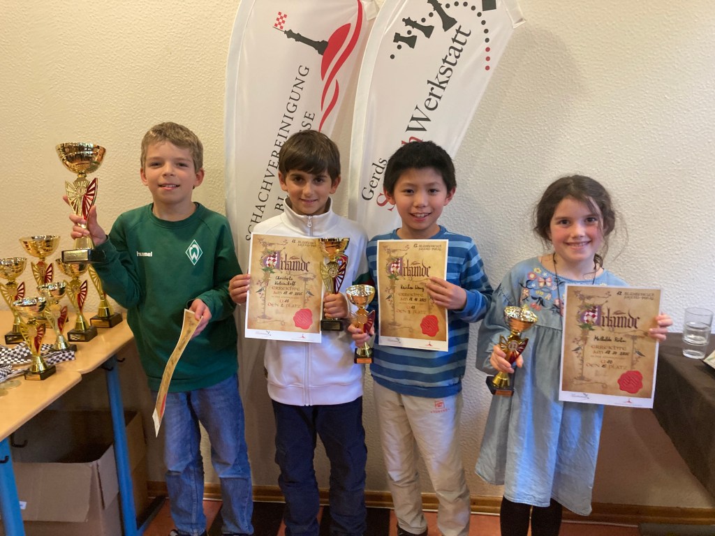 Bei ähnlichem Turnierverlauf musste Kaichen bei den U10ern erst in der letzten Runde den Traum vom ersten Platz begraben, wurde aber mit 5,5 Punkten starker Dritter und nahm – mal wieder – einen Pokal mit nach Hause! Auch Thore bestätigte mit 5 Punkten seine starke Form, und Arjun, Mark und Frederic erreichten respektable 4 Punkte.