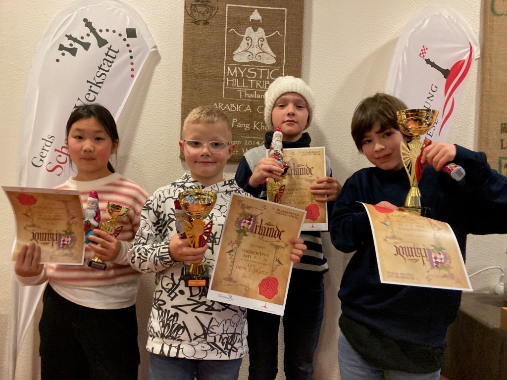 Bei ähnlichem Turnierverlauf musste Arjun S. bei den U10ern am Ende den Traum vom Pokal begraben, landete mit 4,5 Punkten auf dem undankbaren 4. Platz. Gute 4/7 holten Mark O., Siqi H. (bestes Mädchen) und Finn Z.
