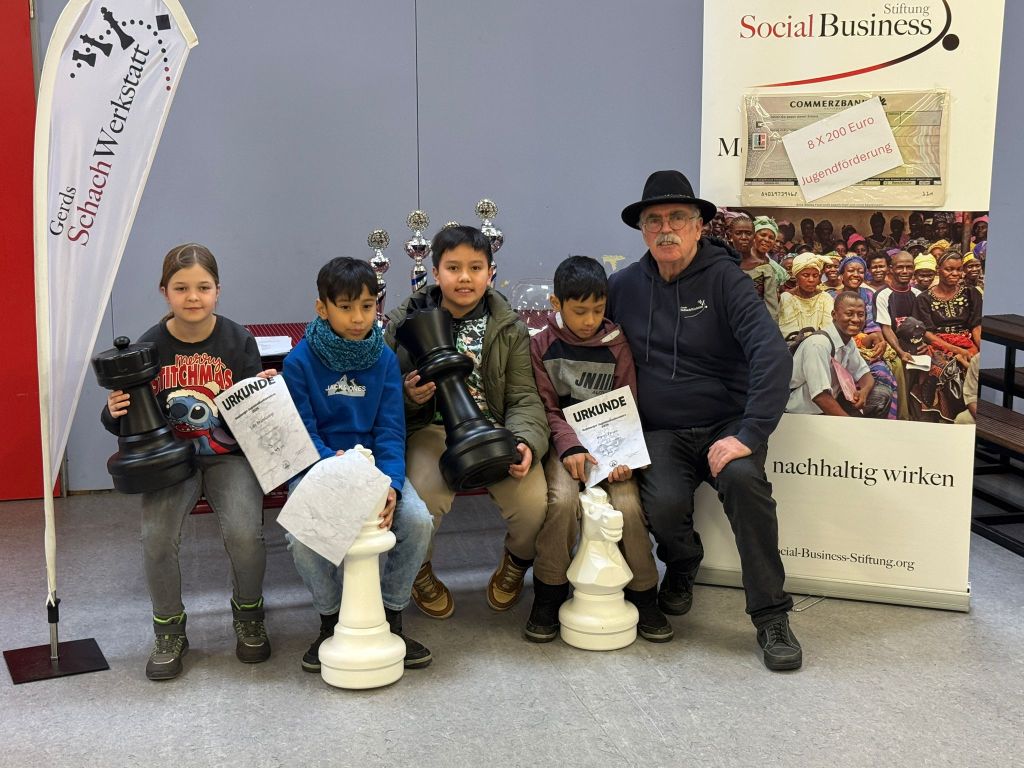 Anlässlich der HJET 2026 verloste „Die Schachwerkstatt“ der Social Business Stiftung unseres Vorsitzenden Gerhard Bissinger erstmals Förderbeträge für Hamburger Schachvereine, die sich in der Jugendarbeit engagieren und zumindest 3 Kinder/Jugendliche pro Altersklasse zu den HJET geschickt haben.