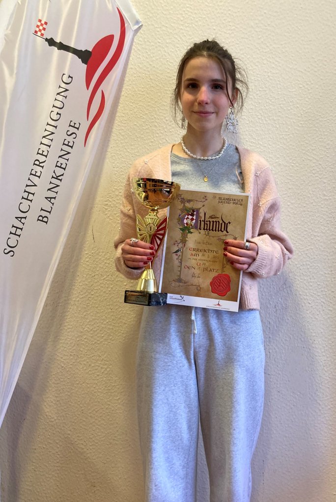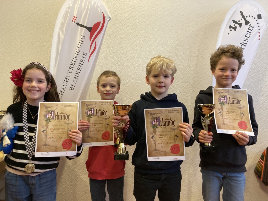 Im Gegensatz dazu stellten wir bei den U14ern die drei besten Teilnehmer, die auch alle zeigten, dass sie in hervorragender Form sind. Nach der LK2 bei den HJET gewann Nua (5,5) nun auch direkt im Anschluss den 14. BJP. Herzlichen Glückwunsch! Mit ebenfalls 5,5 Punkten wurde Noah nur denkbar knapp Zweiter und Aroop mit 5 Punkten Vierter. Dazu kam noch Vivian (4,5) als bestes Mädchen auf Platz 5. Also belegte die SchVgg Blankenese am Ende vier der ersten fünf Plätze. Eine tolle Leistung von allen!
