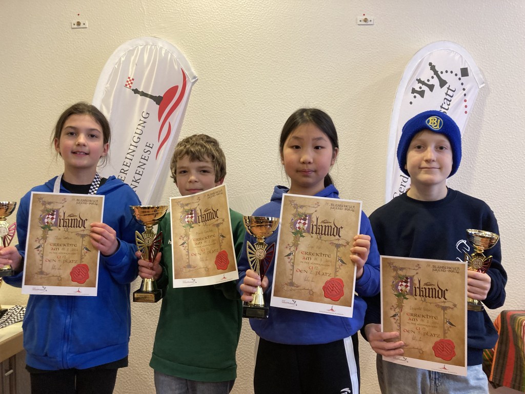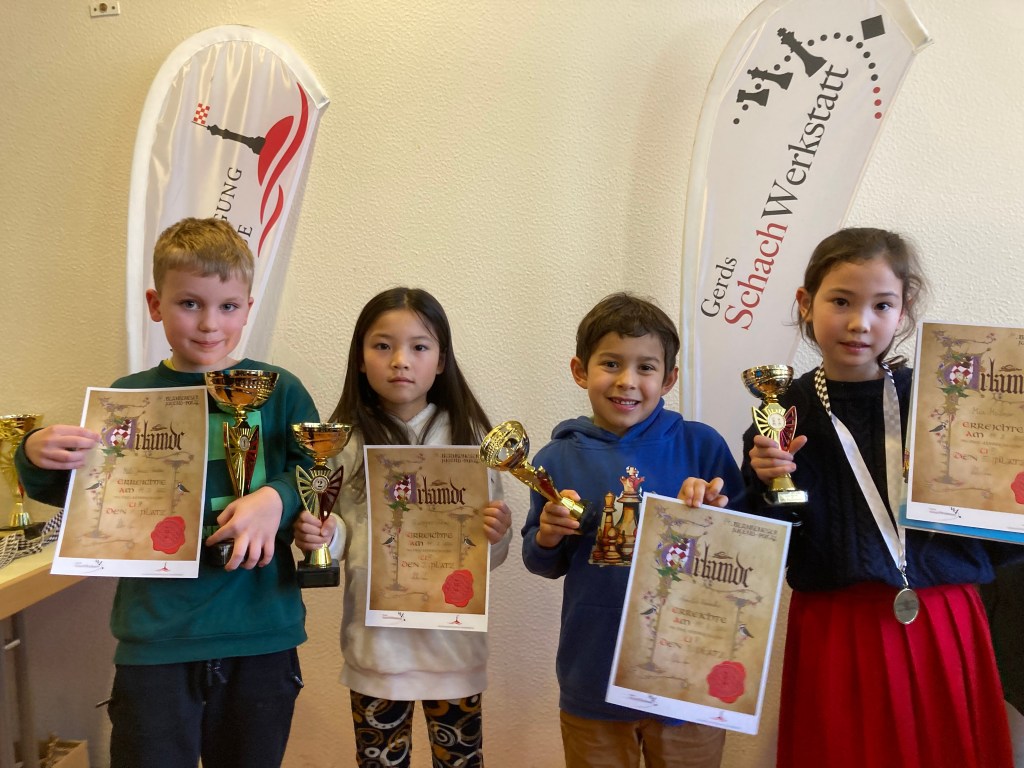 In der Altersklasse U12 waren wir nominell dieses Mal nicht so gut vertreten, aber LinLin (5,0), Thea (4,5) und Thore (4,0) spielten stark, so dass wir hier den 2., 4. und 6. Platz erspielen konnten.