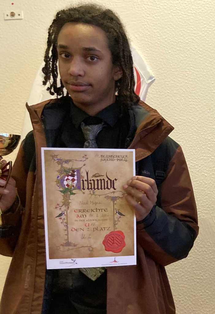 Ähnlich sah es lange Zeit bei den U10ern aus, wo Oscar P. und Mark stark spielten. Beide waren lange oben mit dabei. In der letzten Runde konnte Oscar (5,0) gewinnen, während Mark (4,5) verlor, so dass am Ende ein zweiter und ein undankbarer siebter Platz heraussprangen, denn Mark hatte die höchste Buchholz-Wertung aller Teilnehmer. Unglücklich verlief es für Lennie (4,0), der sich auch an die Spitzenbretter herangepirscht hatte und in der letzten Partie kein Remis durch Zugwiederholung schaffte, weil „zugleich“ seine Zeit abgelaufen war. Manchmal sind Schiedsrichter-Entscheidungen sehr undankbar.