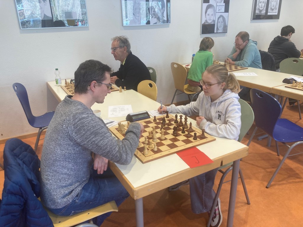 Zum Glück gewann David kampflos, so dass er für die Betreuung der 88 Teilnehmer mitsamt Begleitung zur Verfügung stand. Die Gruppen waren zwar mühsam zu erstellen, wegen der vielen Teilnehmer ohne DWZ, aber es ging erstaunlich flott und so saßen alle tief konzentriert schon um 10:20 Uhr an den Brettern.