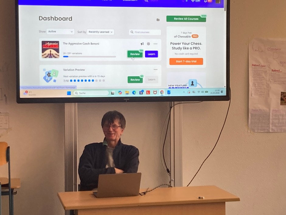 Berthold gab, während die Kinder die 2. Runde am Samstag spielten, eine Präsentation über die Fördermöglichkeiten im Schach, Turniere, Qualifikationen, Turnierabläufe, DWZ-Zahlen und Trainingsmöglichkeiten physisch und online. Diese Ideen und die Möglichkeit konkret einen Experten zu befragen, wurde von den Eltern wieder sehr gut aufgenommen. Danke Berthold!