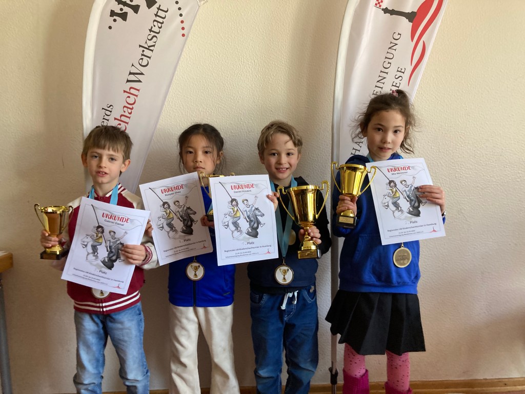 Aufgrund der hohen Teilnehmeranzahl wurde das Turnier in zwei gleichstarken Gruppen ausgetragen. Wir Blankeneser stellten dabei nur 4 der 51 Teilnehmenden. Davon hatten die Schwestern Mia und Millie die besten Aussichten, einen Platz bei den Deutschen Meisterschaften zu erreichen. Der mit Abstand stärkste Teilnehmer, Kann Uz, hatte eine DWZ von über 1400! Wie gesagt: U8! Die Hälfte der Kinder hatte schon eine DWZ (von 750 bis 1170) und knapp ein Viertel der Teilnehmenden waren Mädchen.