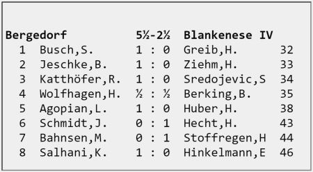 BLA 4 musste mit 3 Reservespielern in Bergedorf antreten. Erich (Brett 8) und Helmut (Brett 5) mussten ihrem […]